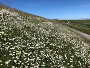 Daar voegt Drontmann, die het Levende Dijk-project aanjaagt, een tweede doel aan toe: ‘Dijken zouden ook de natuur kunnen ondersteunen. Bij Ouwerkerk bijvoorbeeld zijn kilometers dijk bedekt met bitumen. Laag in onderhoud, doelmatig, veilig. Maar ook: een dooie dijk. Terwijl de biodiversiteit achteruit holt en dijken daarin een cruciale schakel kunnen vormen. Daarom is nu bij Ouwerkerk onder andere een proefvlak ingericht waar anders wordt ingezaaid en gemaaid. Zo kunnen kruidenrijke dijken met betere beworteling ontstaan, wat zorgt voor een sterkere dijk en meer natuurwaarde. De Radboud Universiteit doet hier onderzoek naar.’